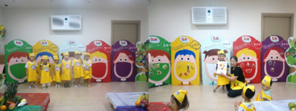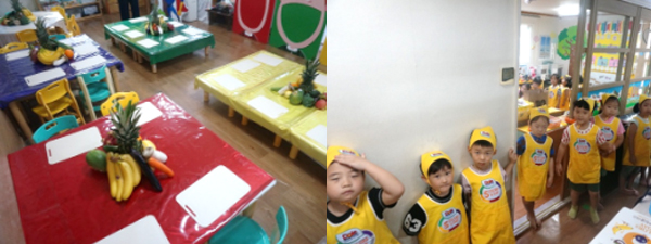수업이 진행되는 강당에서 수업 준비를 시작했답니다. 어떤 친구들을 만날지 강당을 과일과 채소로 가득 교실로 만들어 볼까요?