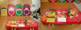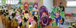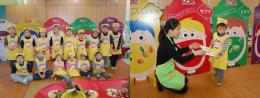 오색 과일과 채소를 골고루 먹고 건강하고 멋지게 된 방법을 영중초등학교 병설유치원 친구들에게 알려 주고 있어요.