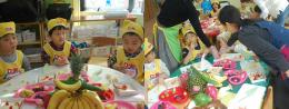 요리 선생님의 지도에 빨강, 노랑, 초록, 보라, 하얀 과일과 채소를 이용해 과일 샌드위치를 만들고 있어요.