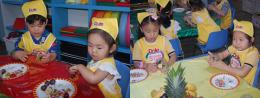 노란 파인애플을 슥삭 자르는 우리 친구~~잘했어요~