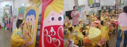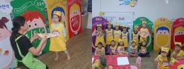 영양 선생님과 함께 과일과 채소 공부를 하고 오색 친구들 입 속에 과일과 채소들을 쏙쏙 넣어 주고 있는 우리 친구~