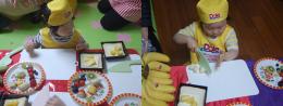 “어디 보자” 노란색 과일과 채소가 어디에 좋은지 생각하고 있는 우리 친구~~ 곰곰이 생각하고 샌드위치를 만들고 있어요. 하얀 바나나도 척척 자르는 우리 친구~~