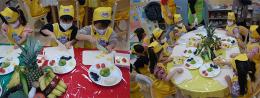 요리 선생님의 설명을 듣고 대변도 잘나오게 하고 우리 피부도 좋게 해주는 노란색 파인애플을 쓱싹 자르고 있는 친구들~ 향긋한 파인애플 냄새에 마스크를 벗고 자른 파인애플을 먹는 친구들도 있었어요.