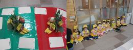 맛있는 알록달록 과일과 채소들이 책상 위에 올려져 있어요. 요리 수업을 위해 도마도 책상 위에 예쁘게 올려져 있답니다. 자연숲어린이집 친구들은 앞치마와 머리 수건을 하고 강당 앞에서 손을 씻기 위해 기다리고 있어요.