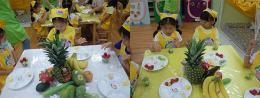 요리선생님의 설명을 듣고 피로 회복을 도와주는 노란색 파인애플을 쓱싹 자른 친구들은 향긋한 파인애플을 냠냠 맛보면서 ‘달콤해서 맛있어요~’라고 말하며 좋아했어요