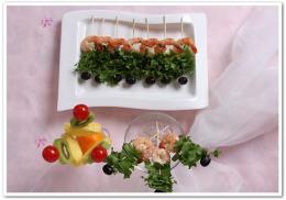 익혀준 새우를 맨 앞에 끼우고 치커리를 몇개 겹쳐 끼운뒤 블랙 올리브를 끼워주면