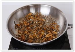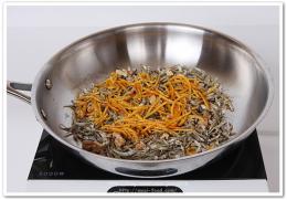 마른팬에 살짝 볶은 멸치와 호두에 기름에 볶은 귤껍질을 함께 넣어