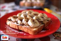 주재료: 식빵(2장), 바나나(중 2개), 땅콩버터(3큰술), 슈거파우더(약간), 초코시럽(적당량)