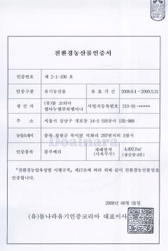 Dole(돌) 친환경농산물인증서