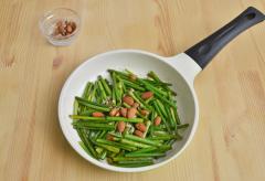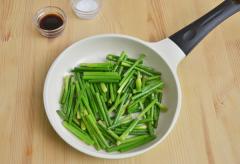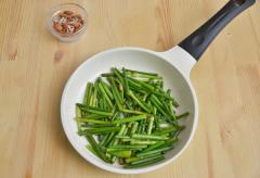 2. 마늘쫑 볶기: 프라이팬에 기름을 두르고 마늘쫑을 중간 불에 2~3분 볶아요.