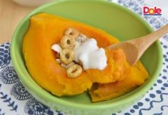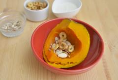 3. 요거트 뿌리기: 찐 단호박에 씨리얼과 요거트를 뿌려요.