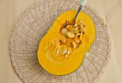 1. 단호박 손질 하기: 단호박을 반으로 자른 후 씨를 빼요.
