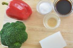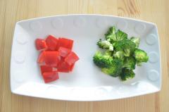 1. 손질하기: 브로콜리, 파프리카, 곤약을 먹기 좋게 잘라요.