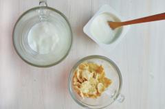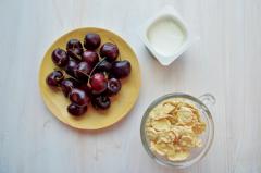2. 체리, 씨리얼, 요거트 담기: 컵에 체리- 씨리얼- 요거트- 씨리얼-체리 순으로 담아요.