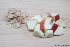 사과는 흐르는 물에 깨끗하게 씻은 후 먹기 좋은 크기로 썰어주세요.