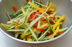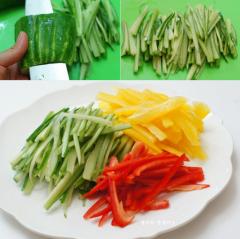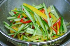 파프리카도 오이 길이에 맞추어 채 썰어 줍니다.