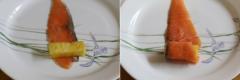 어린잎채소 옆에 파인애플을 감싼 연어를 올려주고