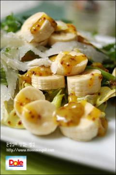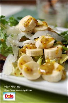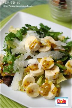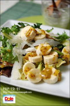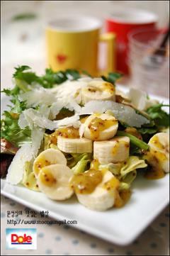 주재료: 돌 바나나(2개), 샐러드용 채소(적당량), 그라나빠다노(적당량)