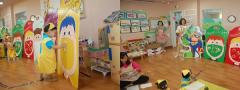 과일과 채소를 오색 칠판에 붙이고 건강맨 아저씨의 건강비법을 듣고 있어요.