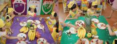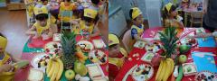 초록 키위와 하얀 바나나를 슥삭 자르면서 먹어보기도 하고 만져 보기도 했답니다.