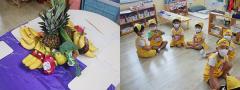 우선 노랑 파인애플을 쓱삭 잘라 냄새도 맡아보고 우리 몸의 어디에 좋은지 한번 더 생각 주머니에 쏙 넣었어요.