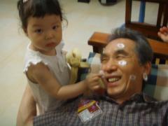 바나나를 무지 좋아하는 하은이가 어느날 할아버지 얼굴을 이렇게 이쁘게 꾸미고 있네요.