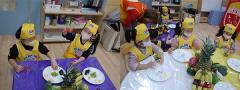 요리 선생님의 설명을 듣고 대변도 잘나오게 하고 우리 피부도 좋게 해주는 노란색 파인애플을 쓱싹 자르고 있는 친구들~ 향긋한 파인애플 냄새에 마스크를 벗고 자른 파인애플을 먹는 친구들도 있었어요.
