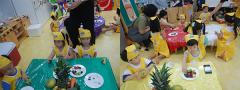 이거 진짜 파인애플이냐며 껍질이 있는 파인애플은 처음 본다며 신기해 하는 친구들이 많았답니다. 책상이 알록달록하게 변하고 오색 칠판 친구들도 짜잔~
