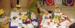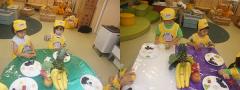과일 샌드위치를 만들고 과일 샐러드를 만들고 있어요. 요리선생님이 5가지 과일과 채소 색깔을 말하면 우리 친구들이 찾아서 투명컵에 담아 보았답니다.