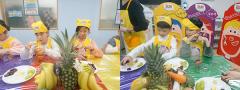 초록색은 우리 몸의 청소부 같고, 하얀색은 면역력에 도움이 되고, 보라색은 눈에 좋은 영양소가 있다는 것을 척척 맞추면서 과일컵 샐러드를 완성했답니다.