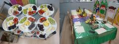 요리수업용 과일을 알록달록 예쁘게 준비하고, 오색 칠판 친구들도 쭉 세워두고, 책상도 길게 붙여서 준비를 완료했어요.