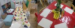 요리수업에 사용할 조각과일들도 준비하고, 영양수업에 사용할 신선한 과일과 채소들도 책상마다 한가득 준비했어요.