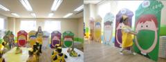 수업이 진행되는 강당에서 수업 준비를 시작했답니다. 어떤 친구들을 만날지 강당을 과일과 채소로 가득 교실로 만들어 볼까요?