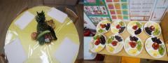 직접 만져보고 관찰할 수 있도록 원물 그대로의 생과일과 채소도 조별 책상 위에 듬뿍 올려두었어요.