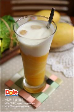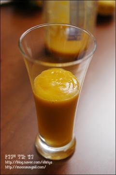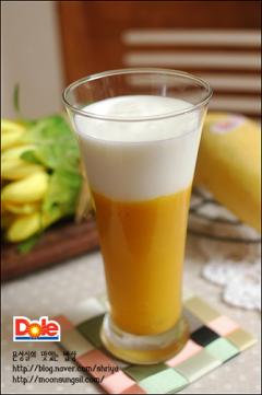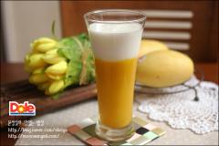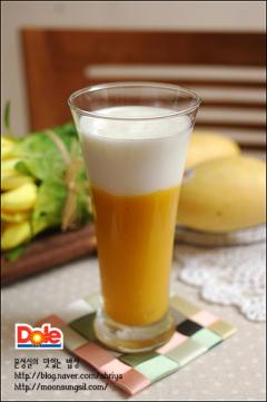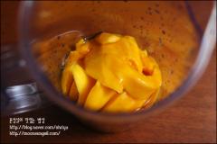 주재료: 망고(2개), 꿀(2), 플레인 요구르트(2팩), 우유(5), 레몬즙(2), 얼음(적당량)