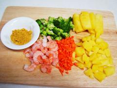 생파인애플 1/2통, 새우살 한 줌, 브로콜리 한 줌, 당근 1/4개