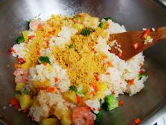 밥을 넣어 잘 섞어가며 볶다가.... 마지막에 카레가루를 넣고 소금으로 간을 맞춥니다.
