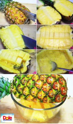 1. 잘익은 파인애플을 골라서 칼로 반을 갈라준다. 이때 잘익은 파인애플이란 색이 선명하고 전체적으로 노란빛깔이 도는 것을 골라준다. 너무 노랗게 되면 물러서 쉽게 상하니까 적당한 색과 향을 지닌 것으로 고른다.