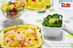 6. 과즙을 쫙 뺀 파인애플 통에 볶음밥을 담아서 완성하면 된다. 이때 고수잎이 있으면 얹어서 포인트를 줘도 좋고 고수향이 싫으면 허브종류나 잎채소로 포인트를 준다.