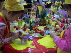 어린 친구들의 예쁜 손을 거쳐 신선한 영양만점 과일 바구니가 만들어져가고 있습니다.