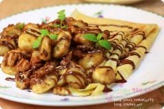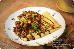 접시에 크레이프를 접어서 깔고.. 그 위에 피칸과 함께 익힌 바나나를 올리고 쵸콜렛을 뿌려주었답니다.