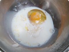 계란과 우유를 넣어 핸드 거품기로 잘 섞어주세요..