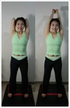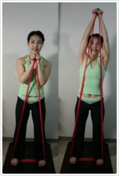 밴드를 양 발에 고정 시키고 밴드를 잡고 팔꿈치를 구부려 양 귀에 닿도록 팔을 위로 듭니다.