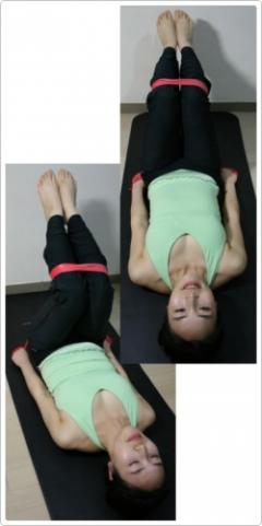 엉덩이와 무릎을 구부린 상태에서 바로 눕고 밴드를 무릎 위에서 가로질러 밑으로 잡아 당깁니다.