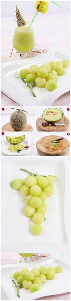 메론을 화채스푼을 이용해 아이스 크림 모양으로 떠내서모양을 만들고 남은 과육을 이용해 펀치를 만들어 내세요