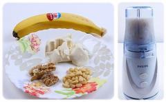 아침대용으로도 좋은 견과루 바나나두유가 완성되였습니다.