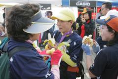 아침 일찍부터 모인 부지런한 건강한 많은 사람들, 그리고 건강 과일 돌 바나나!