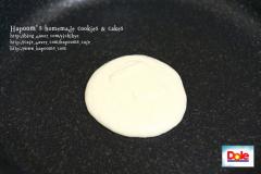 국자로 스마일무의 윗면에 팬케익 반죽을 적당히 떠 올립니다.