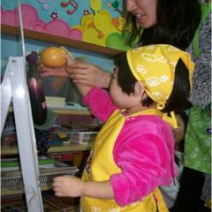 색깔 칠판에 같은 색깔대로 과일과 야채를 붙여 보는 우리 친구들