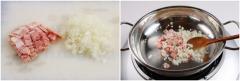 팬을 달궈 베이컨과 양파를 볶아주세요 ( 기름을 두르지 않아도 베이컨에서 기름이 나와 괜찮아요)
